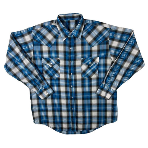 Vintage Western Style Blue White Grey Black Check Long Sleeve Popper Cotton Blend Shirt