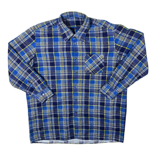 Vintage Navy White Blue Yellow Plaid Check Long Sleeve Button-Up Flannel Shirt