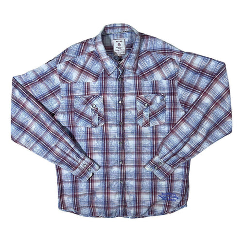TTD Western Style Plaid Check Panel Blue Denim Popper Long Sleeve Shirt