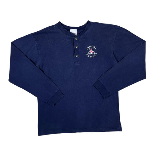 Vintage ARIZONA WILDCATS Embroidered College Logo Long Sleeve Navy Blue Henley Button T-Shirt