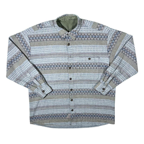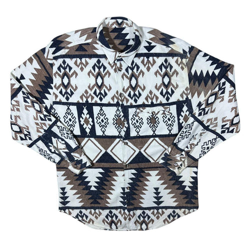 Vintage 90's Aztec Crazy Abstract Patterned White Navy Brown Long Sleeve Flannel Shirt