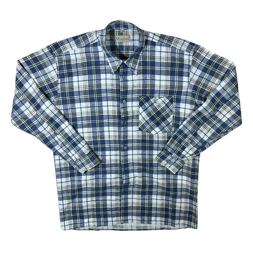 Vintage Mative Blue White Yellow Plaid Check Long Sleeve Cotton Flannel Shirt