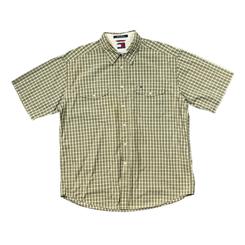 Vintage TOMMY HILFIGER Brown Beige Plaid Check Mini Logo Short Sleeve Cotton Shirt