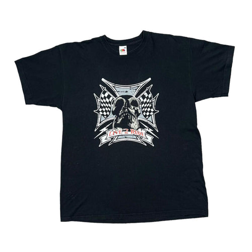 LIVE 2 RIDE Gothic Biker Racing Flag Skull Spellout Graphic T-Shirt