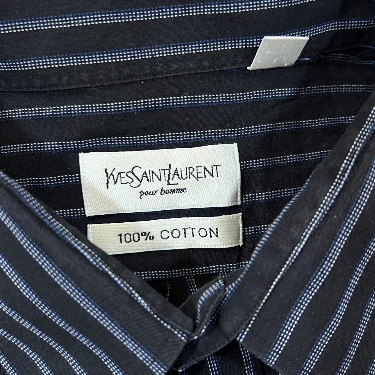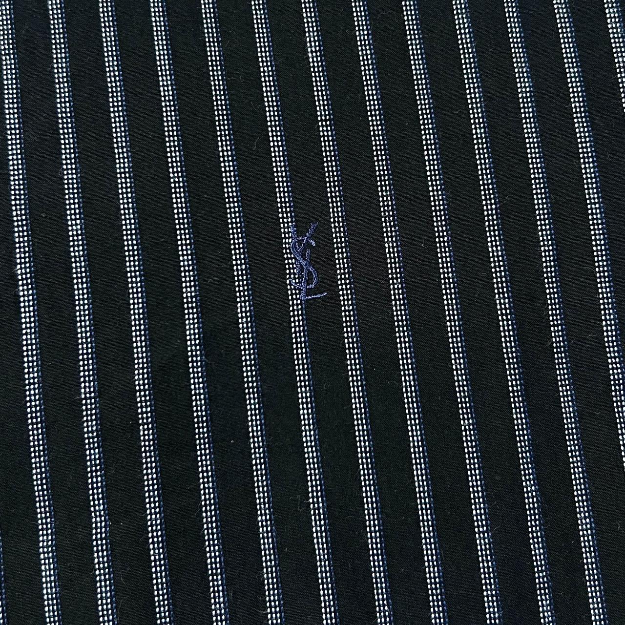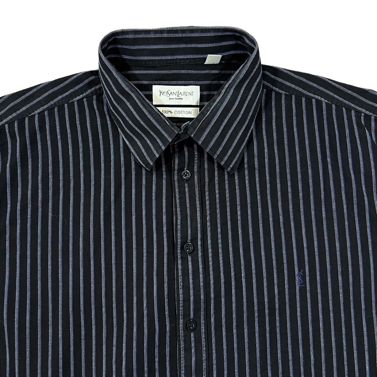 Early 00's YVES SAINT LAURENT YSL Mini Logo Striped Long Sleeve ShirtSize: XXL (See measurements)Colour: Black/Blue StripedDetail: Embroidered mini logo to chestCondition: Light general wear as expectedMeasurements: Pit to Pit: 27”Length: 30”Shoulder to Cuff: 25”#9956