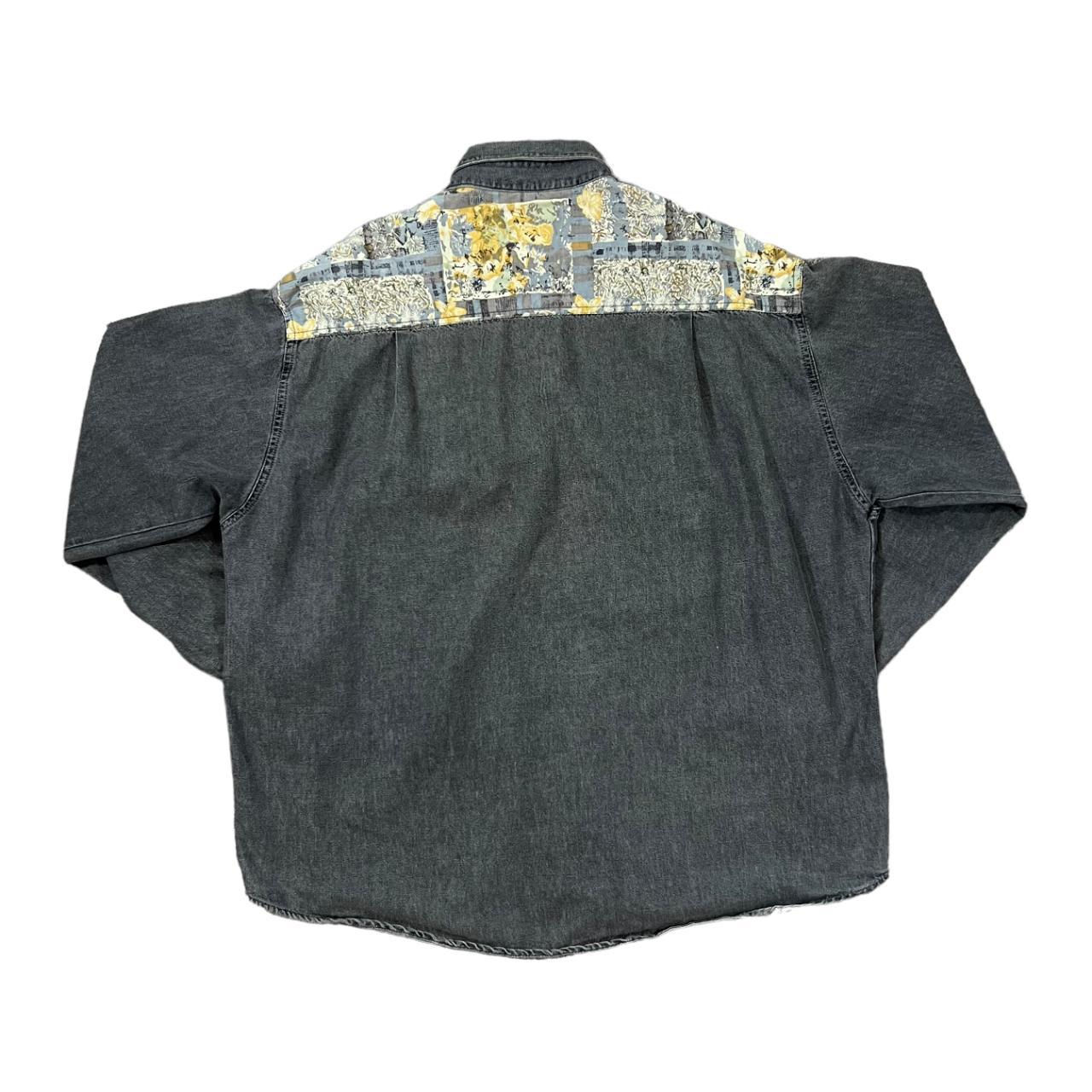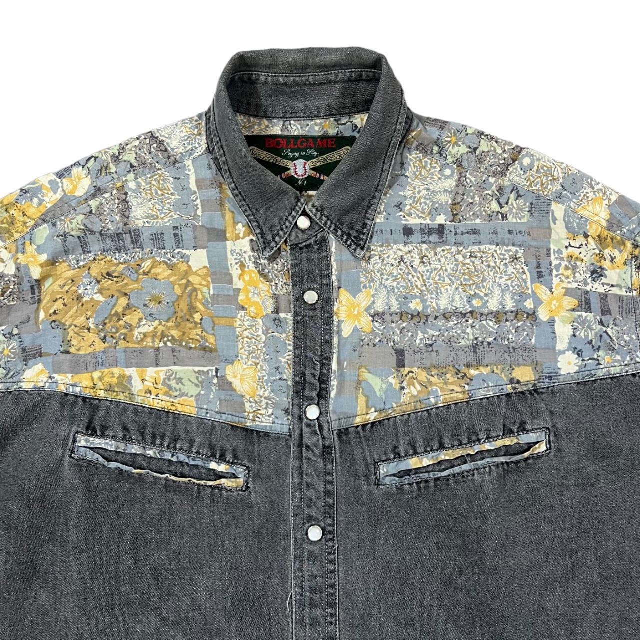 Vintage 90's BOLLGAMES Crazy Pattern Panel Pearl Snap Popper Long Sleeve Grey Denim Shirt