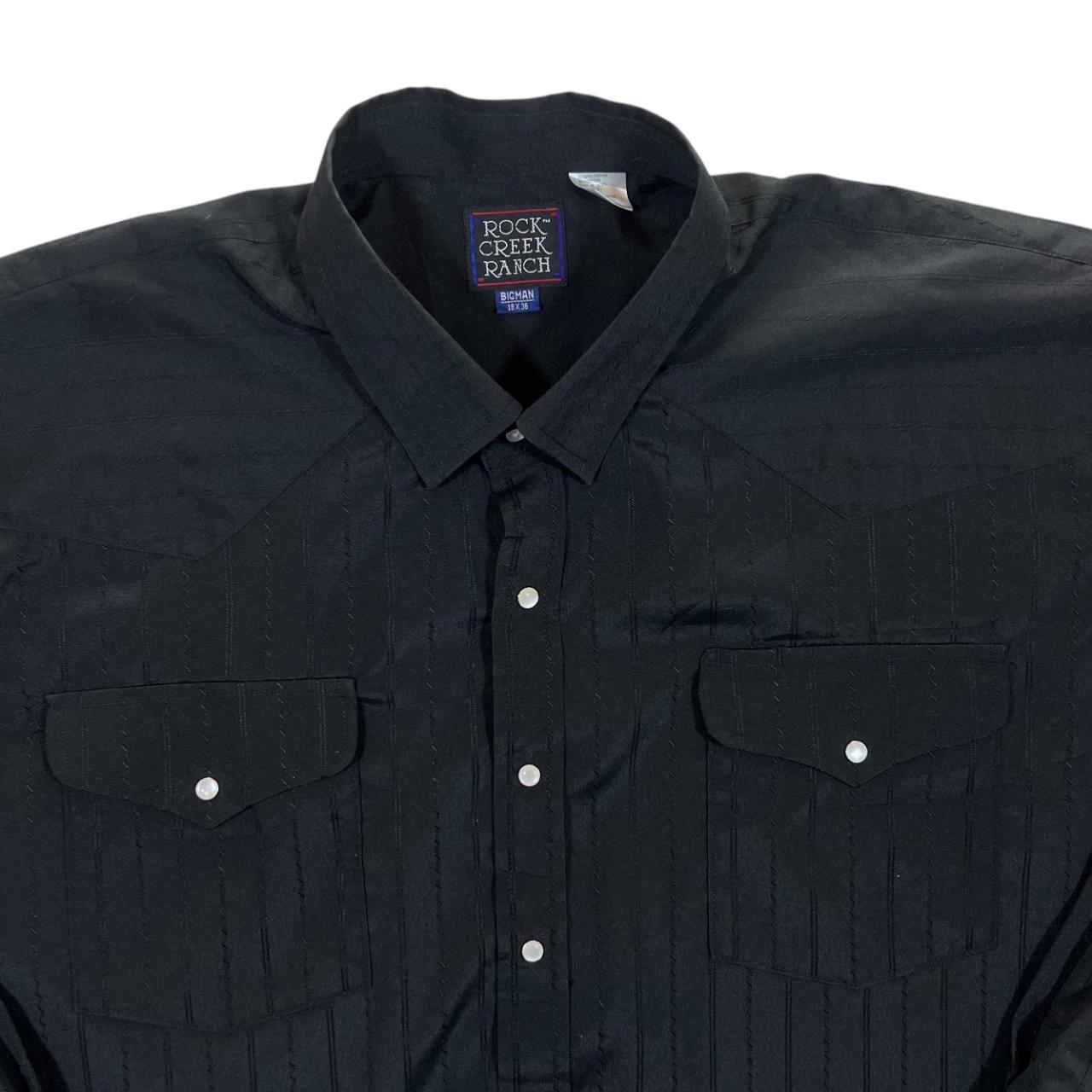 Vintage Rock Creek Ranch Cowboy Western Pearl Snap Popper Long Sleeve ShirtSize: 18 X 36 best fits 3XL (See measurements)Colour: BlackDetail: 80% polyester, 20% cotton material.Condition: Light general wear as expectedMeasurements: Pit to Pit: 28"Length: 33"Shoulder to Cuff: 25"#BY23