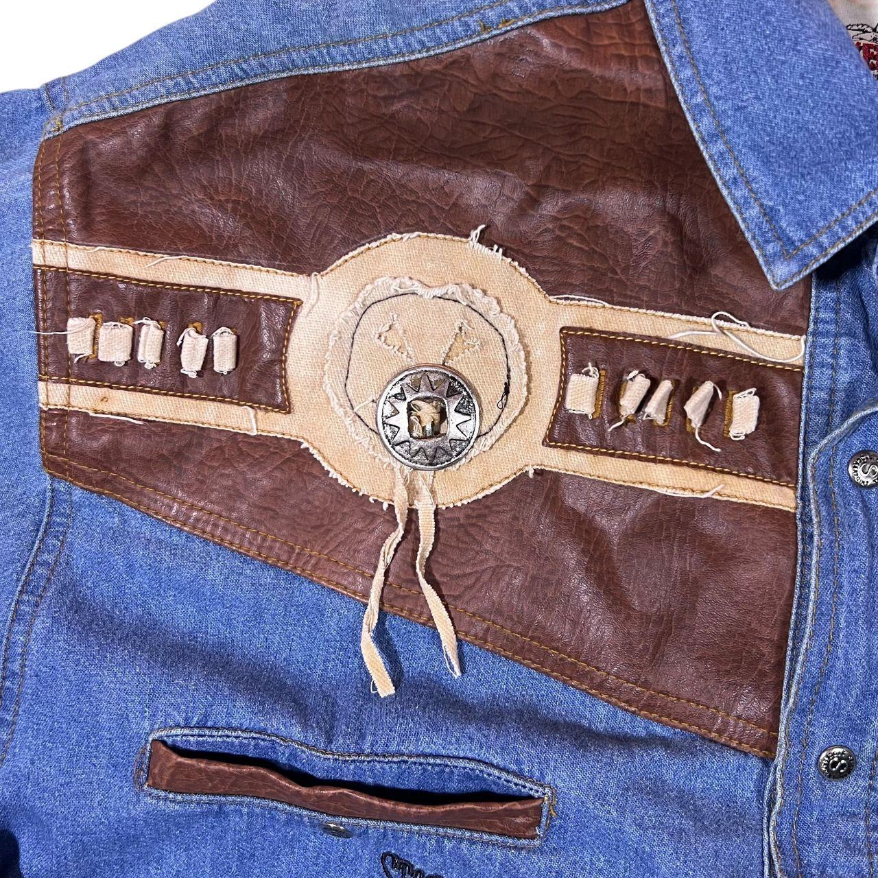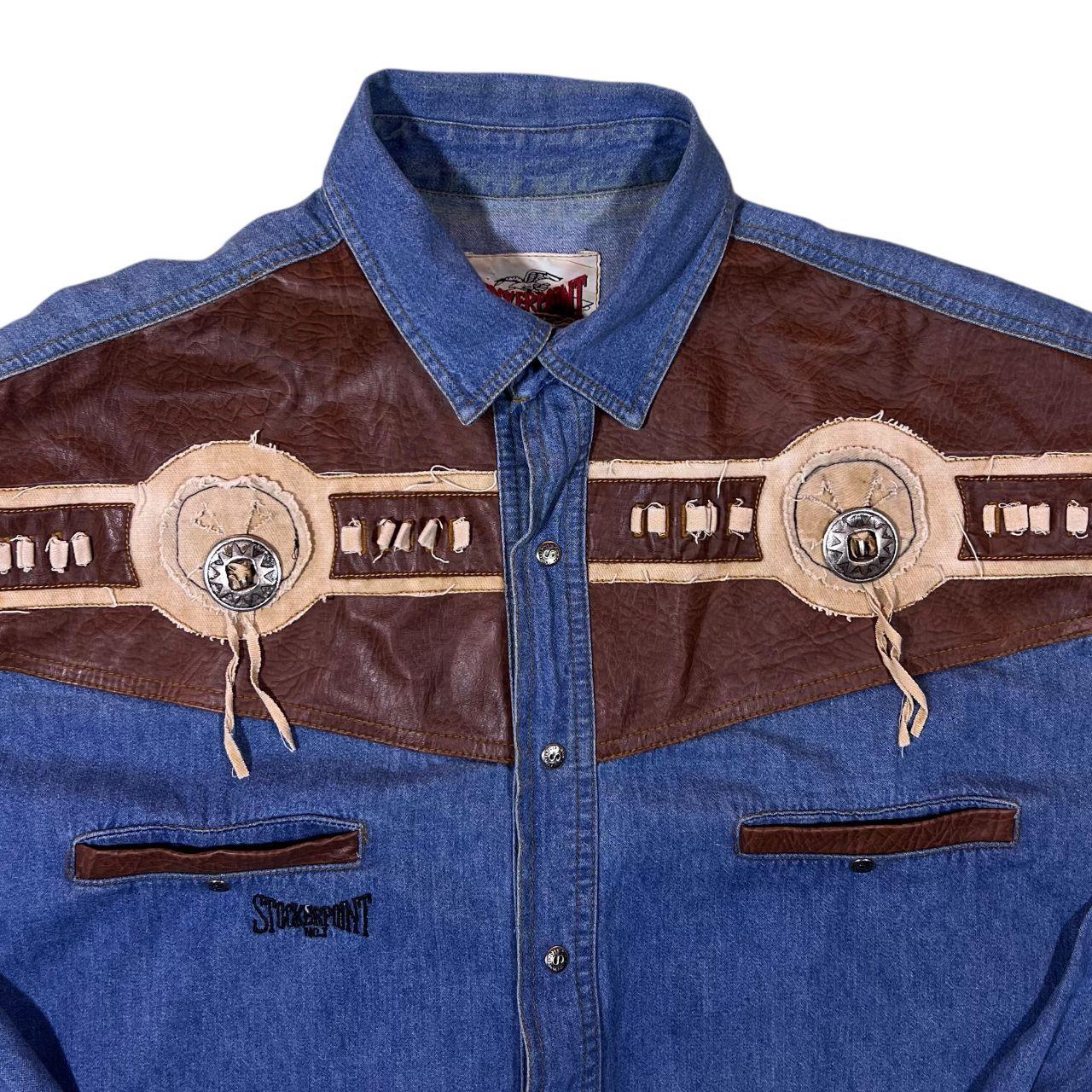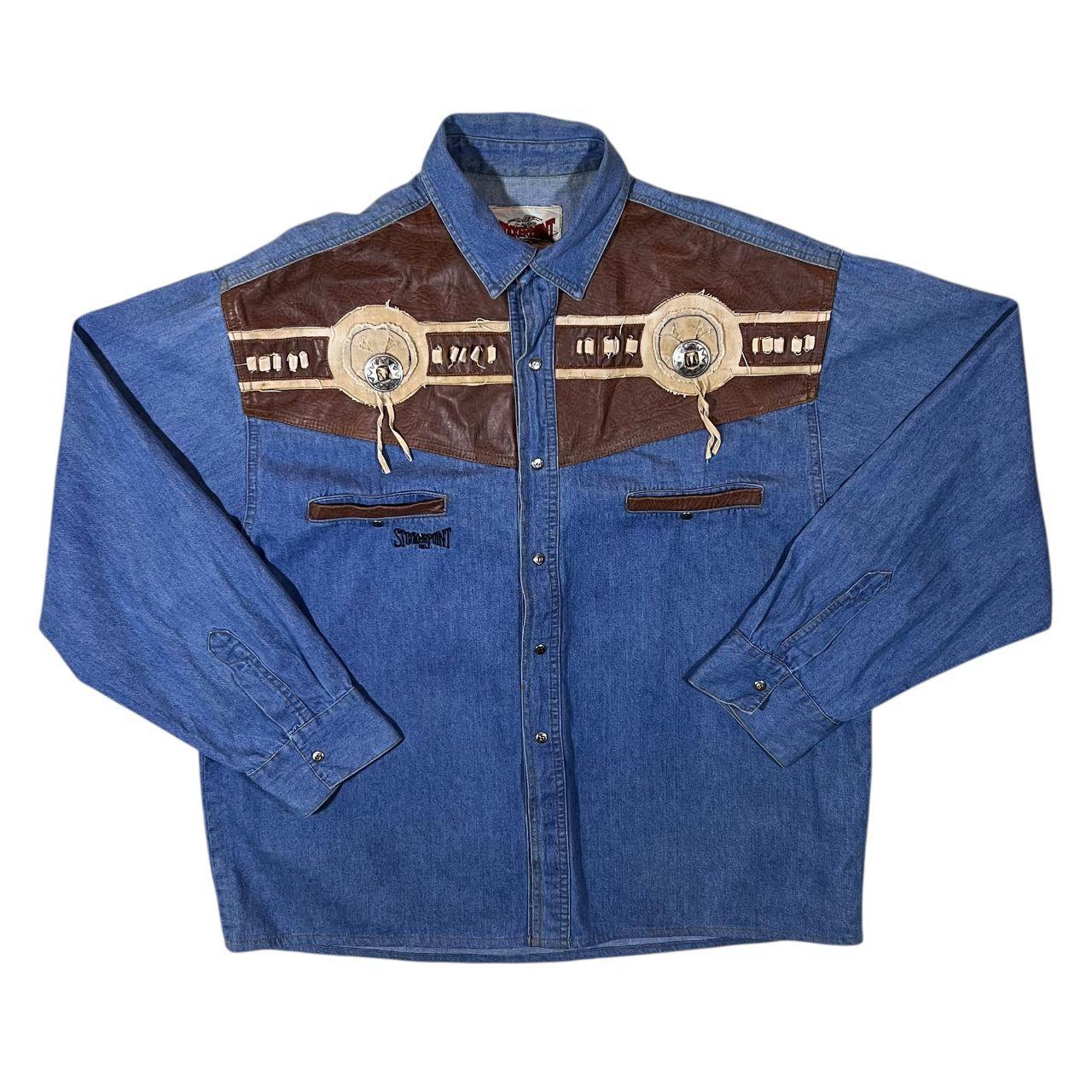 Vintage Stockerpoint Cowboy Western Blue Denim Leather Panel Popper Long Sleeve Shirt