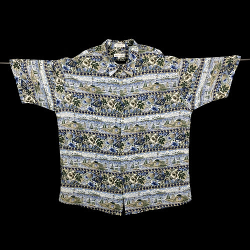 PIERRE CARDIN Hawaiian Tropical Floral Beach Lighthouse Patterned Rayon Shirt