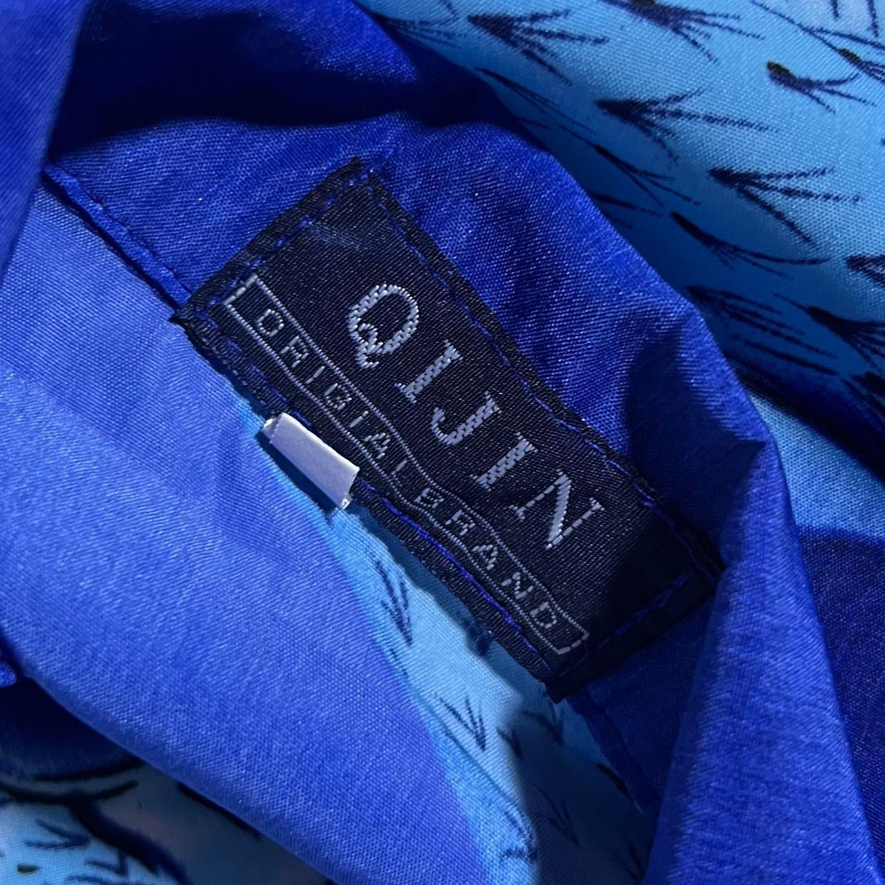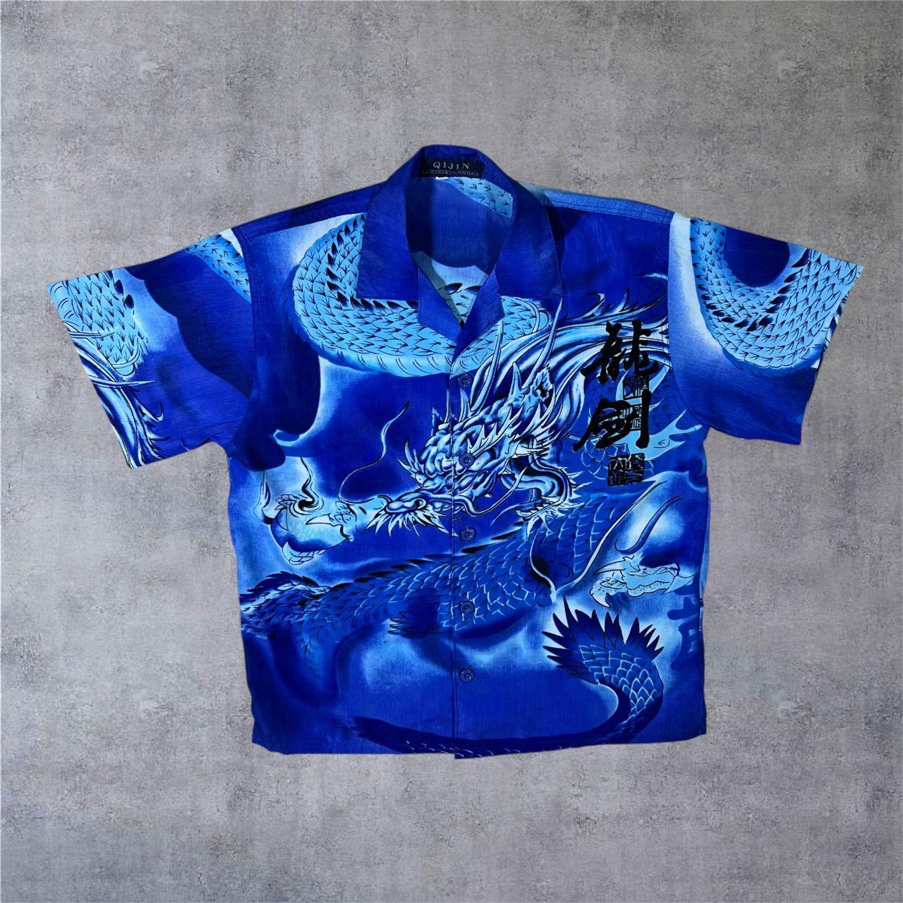 Early 00's Qijin Goth Y2K Dragon Graphic Blue Open Collar Shirt