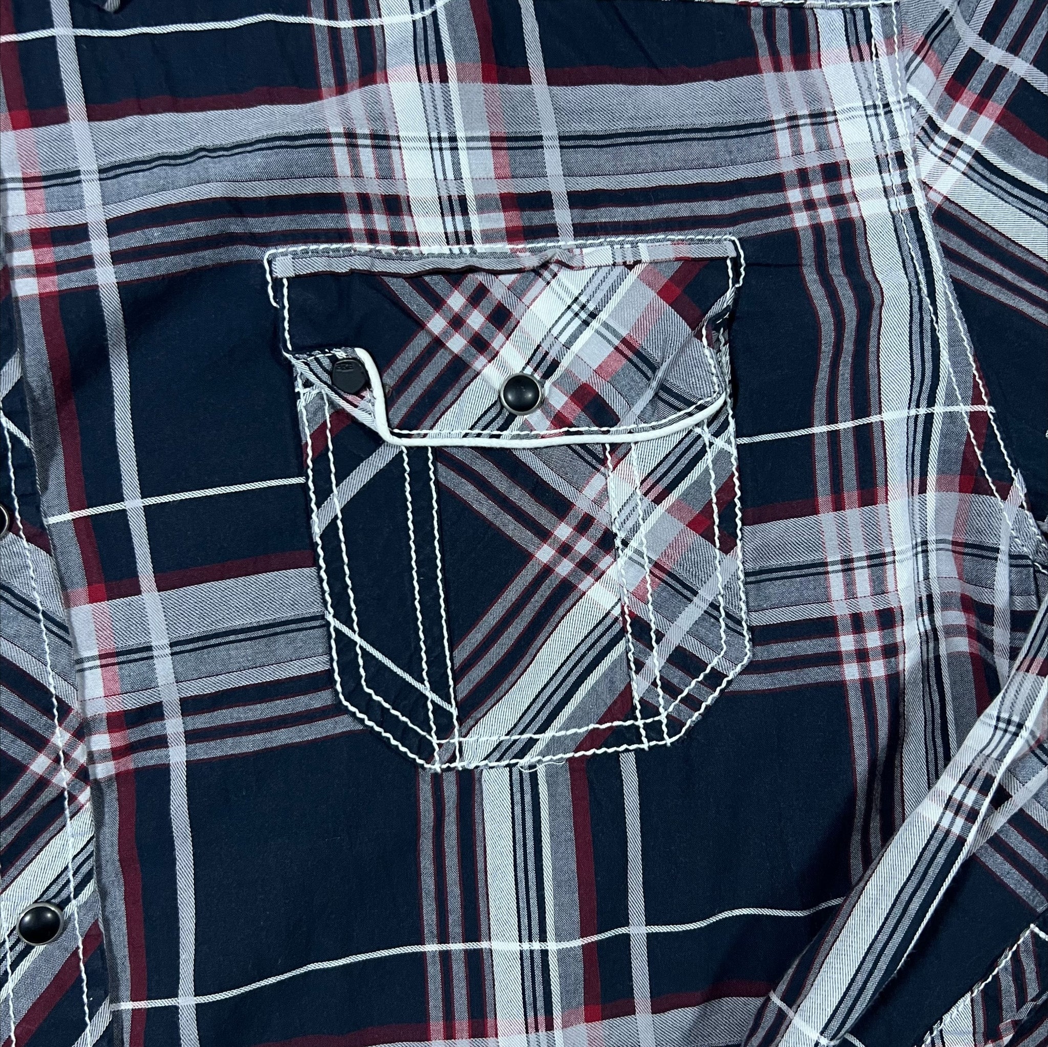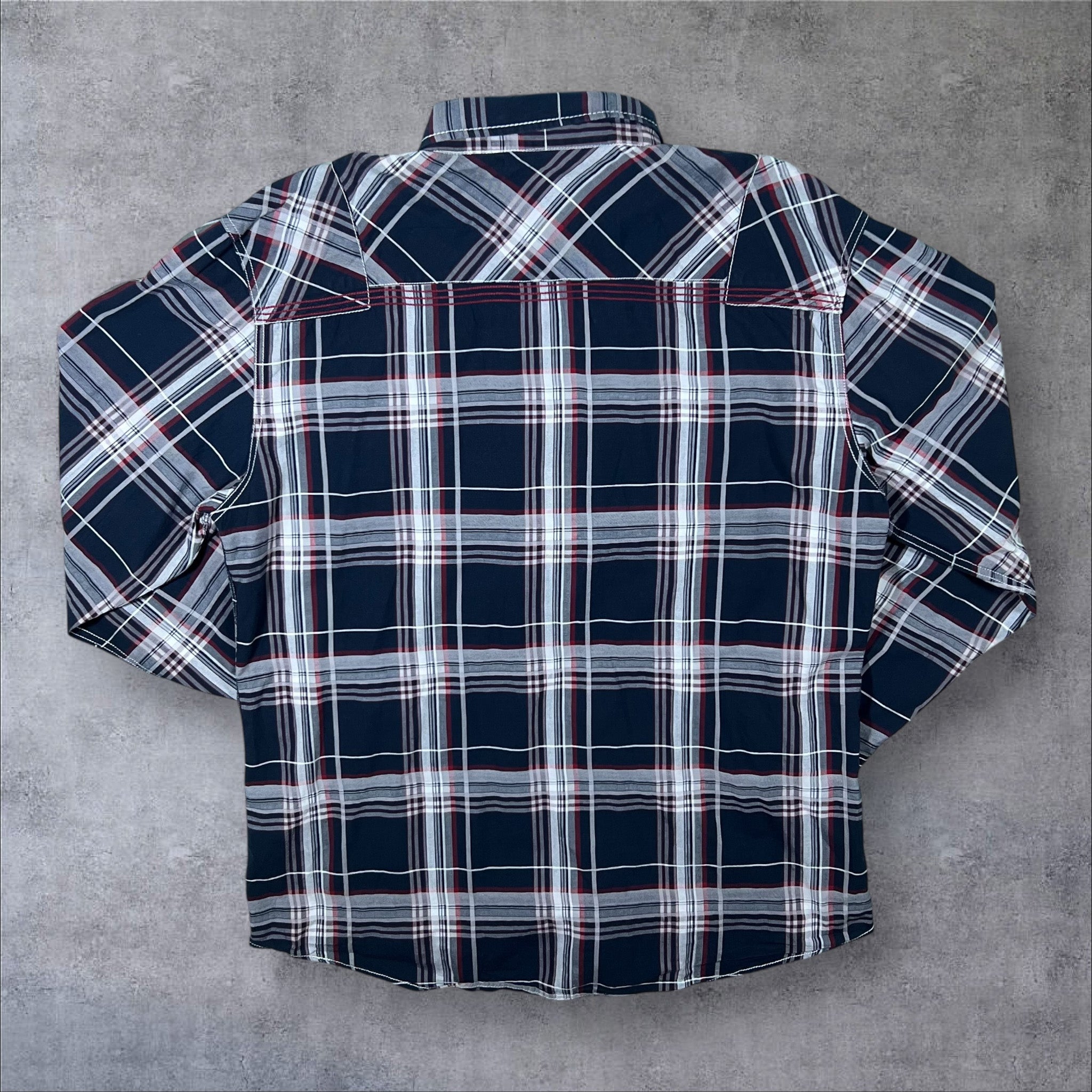 Size: XXL (See measurements)Colour: Navy Blue/Red/Grey/White CheckDetail: 100% cotton. Made in China.Condition: Light general wear as expected