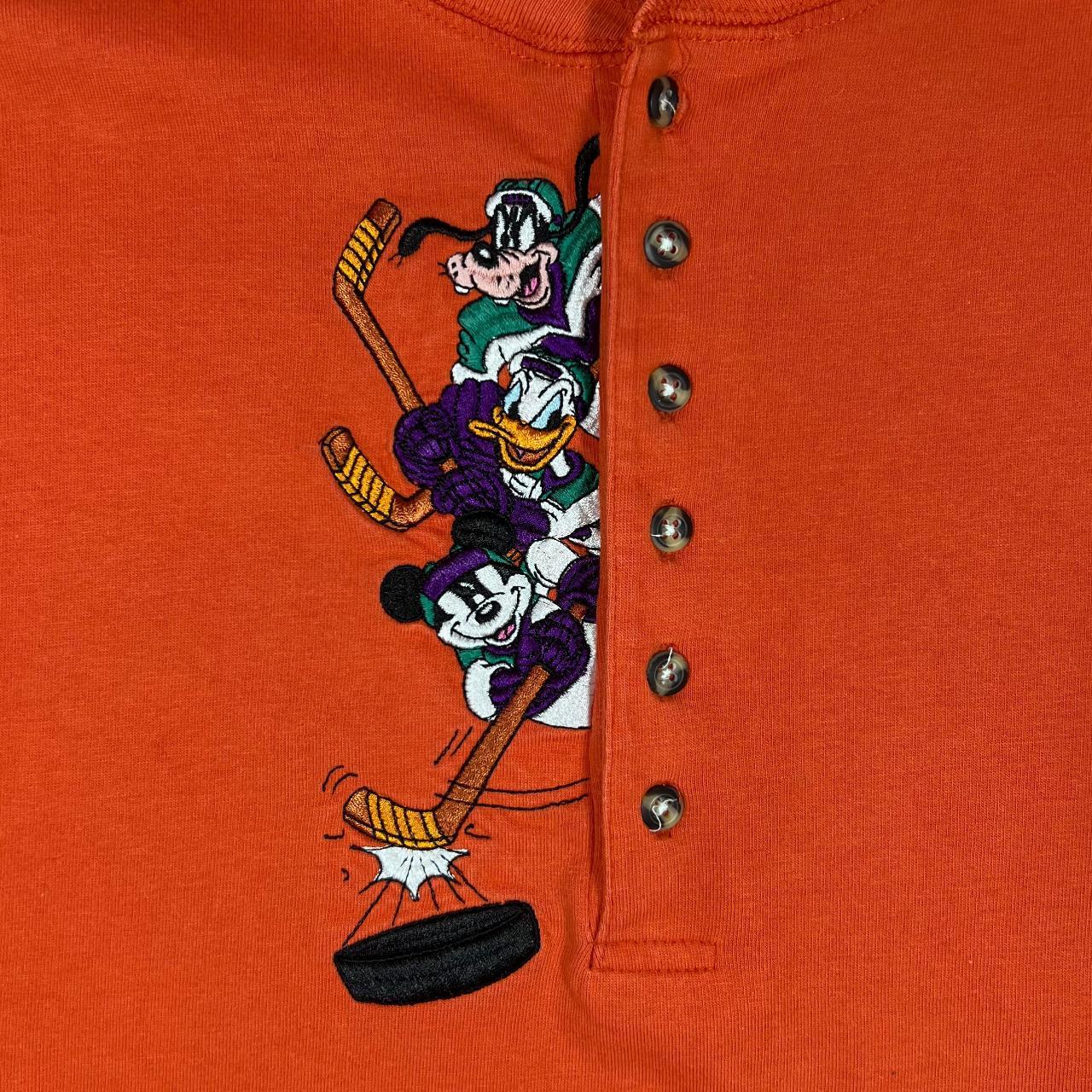 Vintage 90's The Disney Store Embroidered Hockey Character Henley Button Long Sleeve T-ShirtSize: XL (See measurements)Colour: OrangeDetail: Embroidered character design to frontCondition: Light general wear as expected.Measurements: Pit to Pit: 24"Length: 31"Shoulder to Cuff: 23.5"#12000