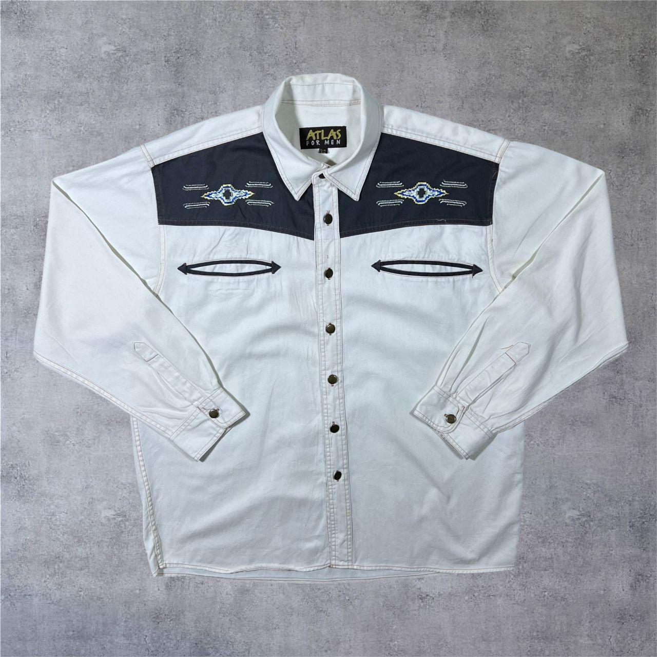 Vintage Atlas For Men Embroidered Aztec Panel White Cotton Long Sleeve Shirt