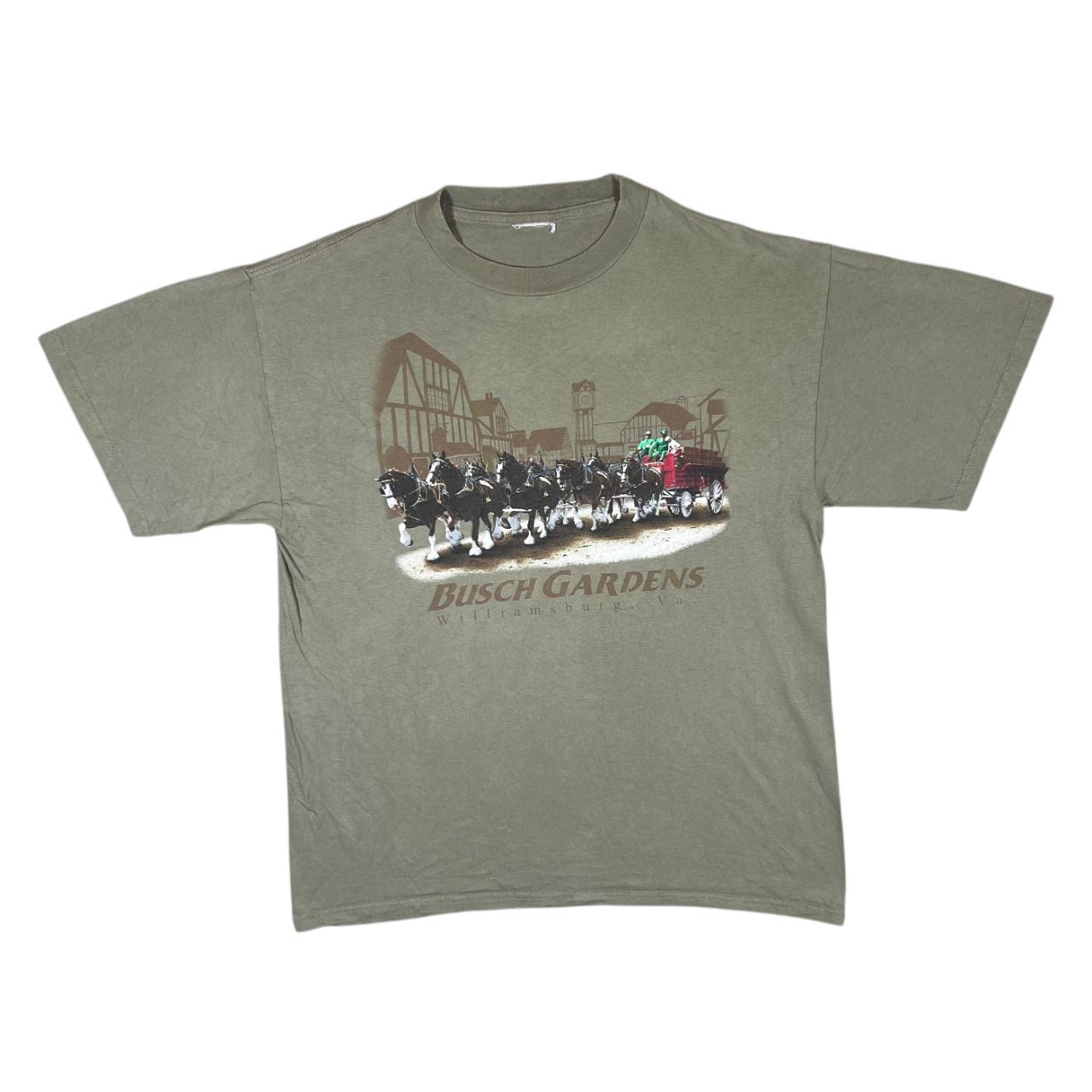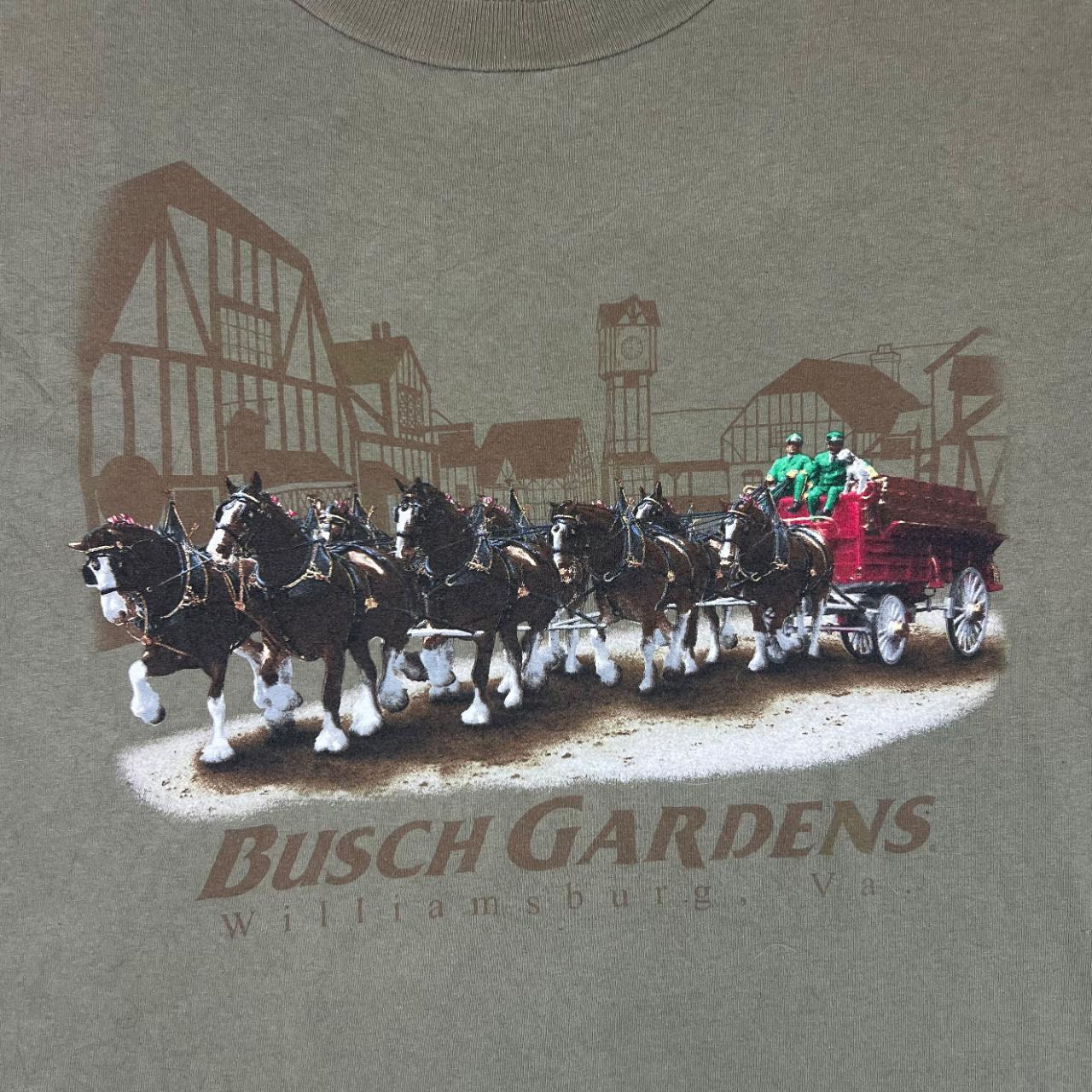 Vintage BUSCH GARDENS "Williamsburg" Horse Carriage Souvenir Graphic T-ShirtSize: Label cut but fits Large (See measurements)Colour: KhakiDetail: Graphic souvenir print to frontCondition: Small pinhole to back picturedMeasurements: Pit to Pit: 22.5”Length: 29”Shoulder to Cuff: 8.5”#11704