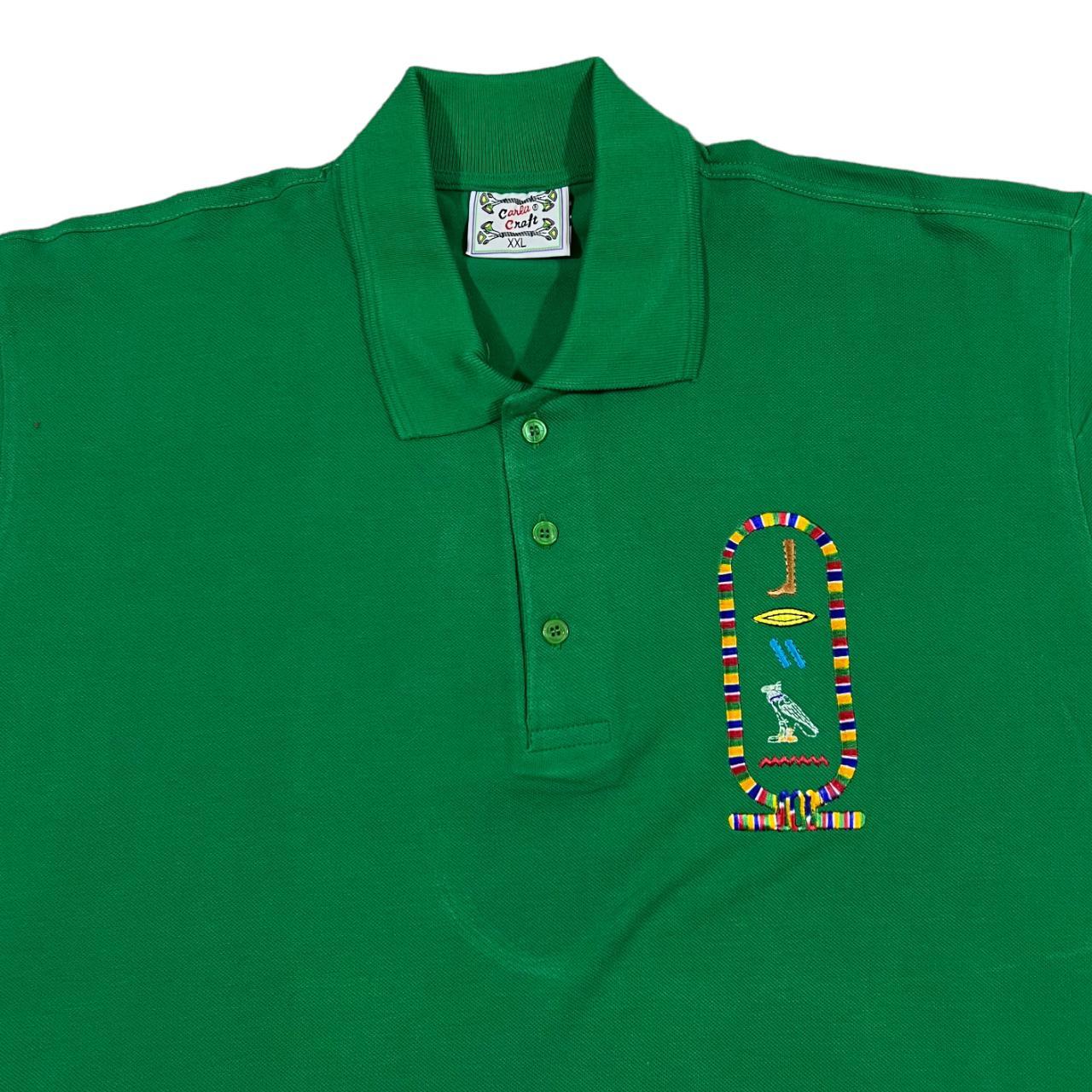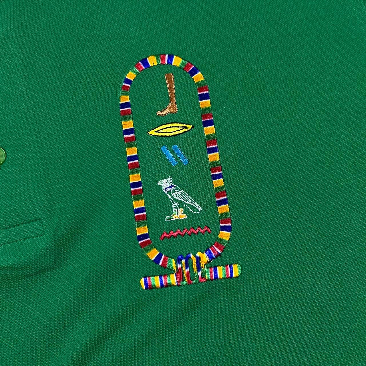 Detail: Embroidered Egyptian hieroglyth design to chest