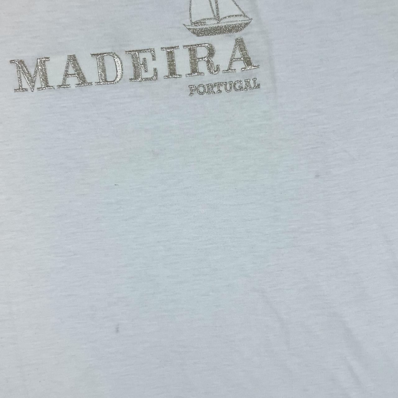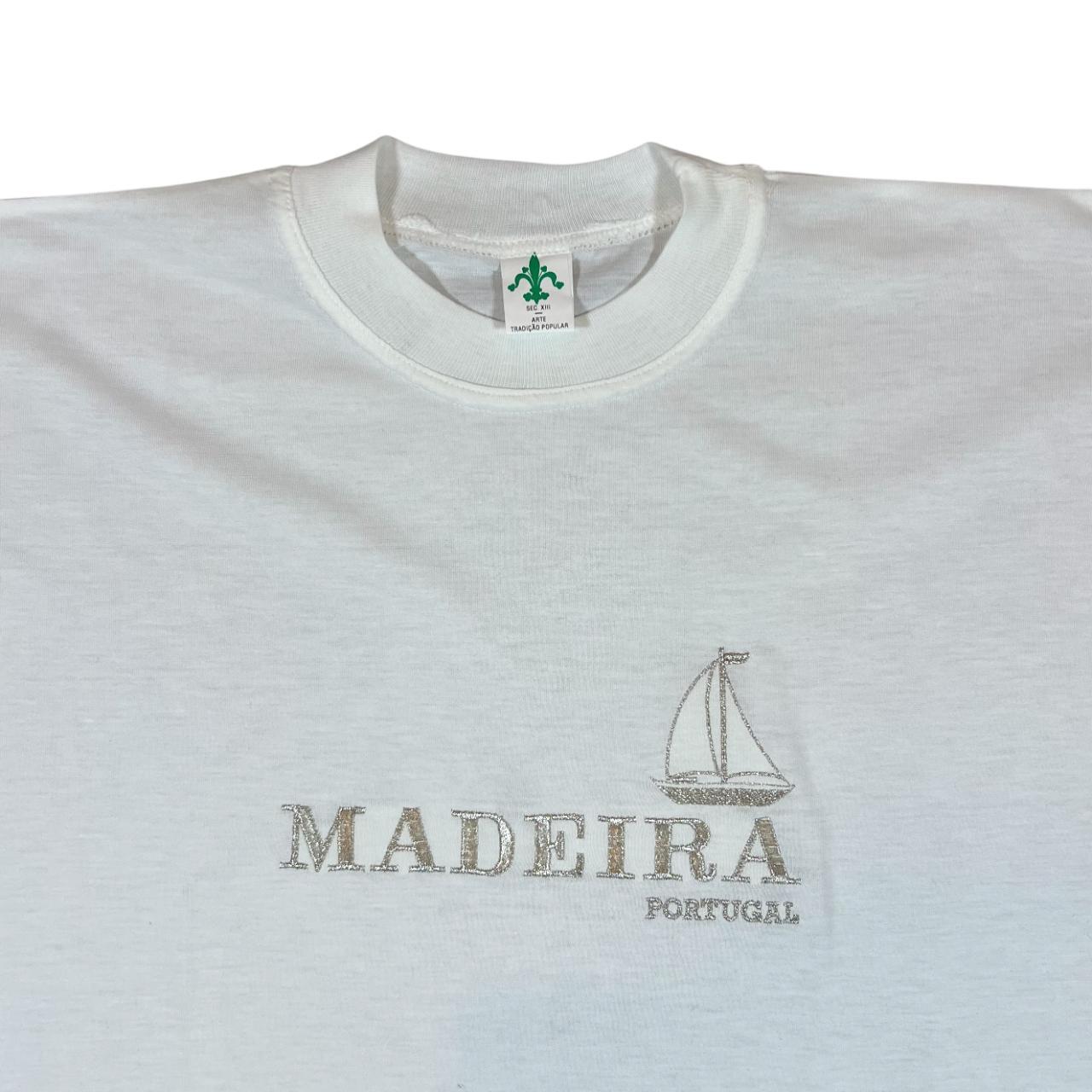Vintage MADEIRA PORTUGAL Embroidered Glitter Souvenir Graphic White T-ShirtSize: Large (See measurements)Colour: WhiteDetail: Embroidered glitter spellout design to front Condition: Light flaws pictured to frontMeasurements: Pit to Pit: 21”Length: 29”Shoulder to Cuff: 8.5”#12175