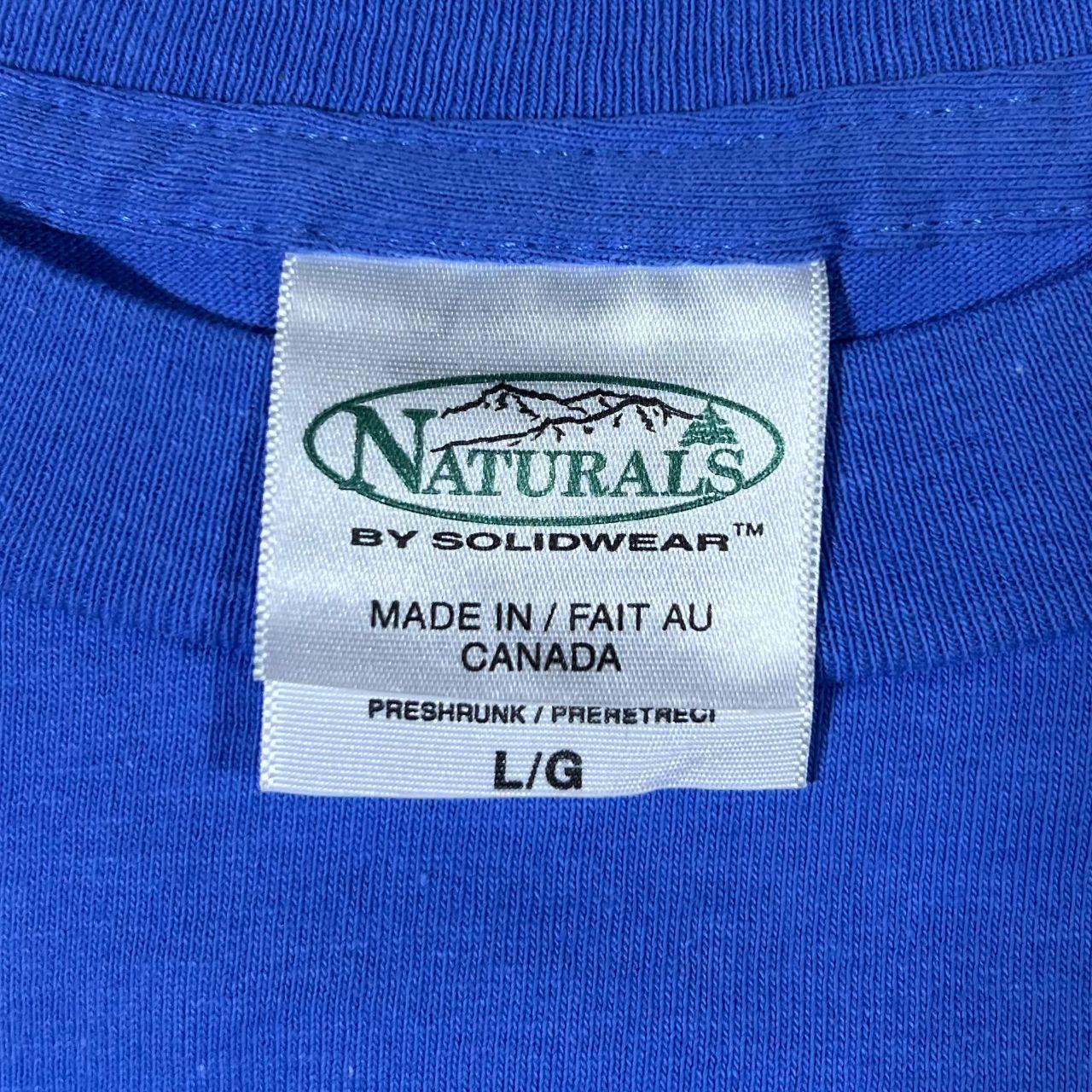 Size: Large (See measurements)Colour: BlueDetail: Graphic spellout print to front. Made in Canada.Condition: Light general wear as expected